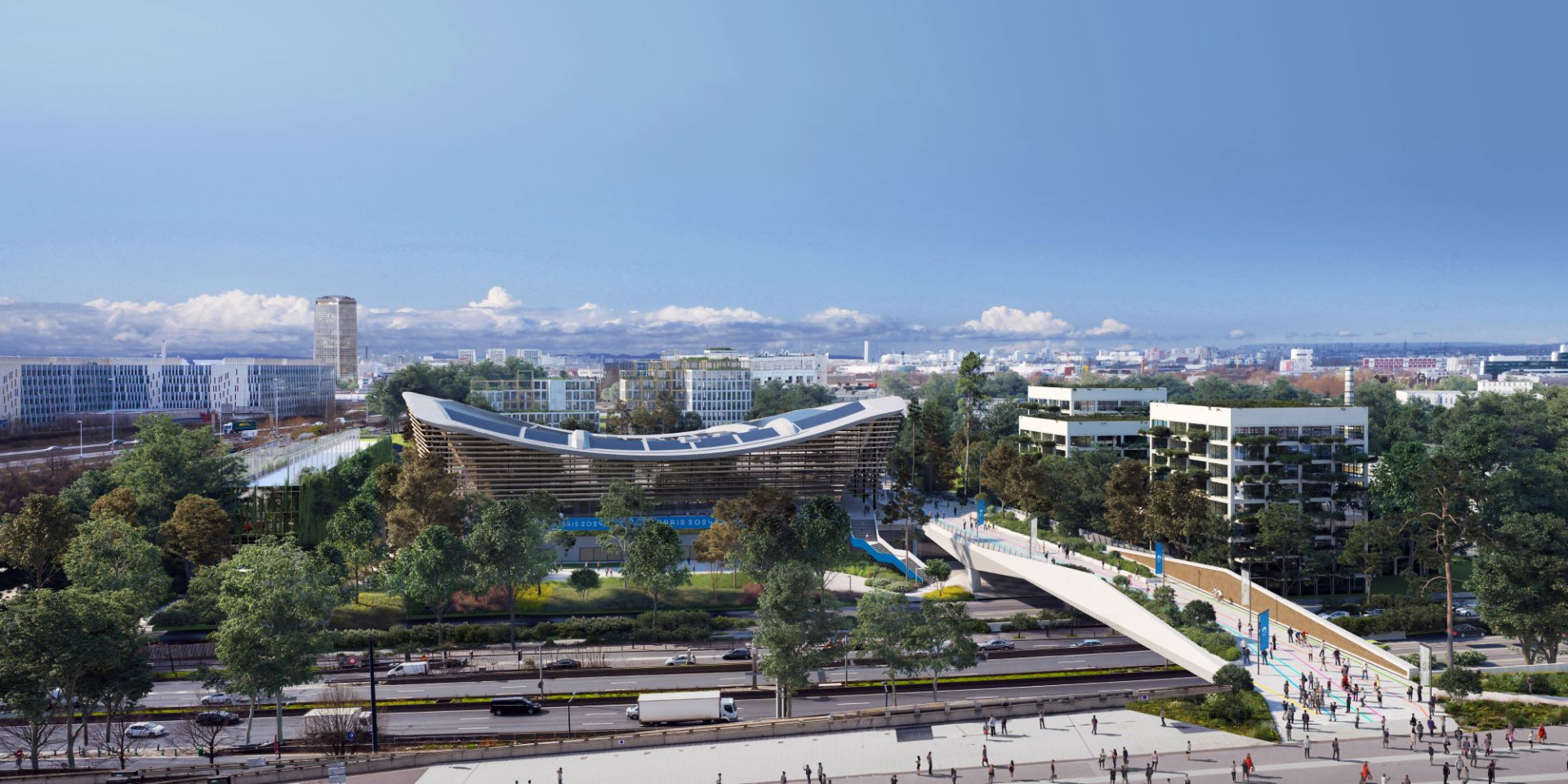 Equipement bas carbone, le Centre Aquatique est entièrement conçu en matériaux bio sourcés. Sa charpente et son ossature, composées de bois, sont pensée pour s'intégrer aux futurs espaces verts du quartier. Doté d'un toit de 5 000 m2 couvert de panneaux photovoltaïques, il devient l'une des plus grandes fermes solaires urbaines de France et assure son auto-suffisance en énergie.